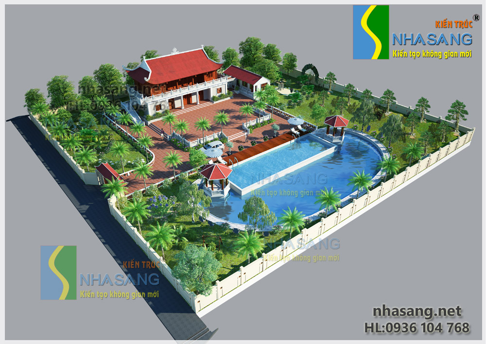 Tổng thể sân vườn: Với bố cục không gian nhà ở truyền thống Bắc Bộ: Nhà chính - Bếp - Sân trước nhà - Hàng cau trước sân và 2 bên cổng ngõ. Lối vào được thiết kế tại vị trí có thể quan sát ngay toàn cảnh Nhà, Sân vaf khu vực bể bơi - hồ nước, ngoài ra về phong thủy lối vào còn là lường sinh khí tràn qua các không gian sân vườn.
