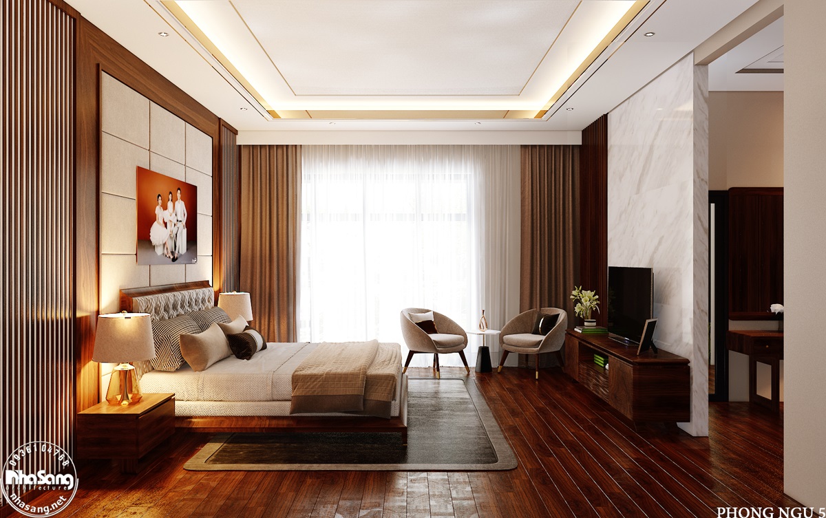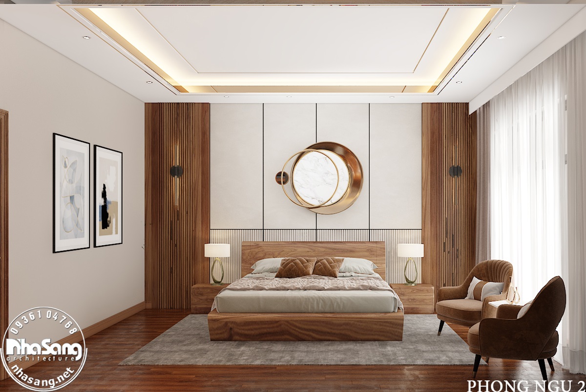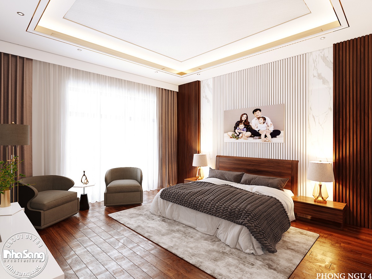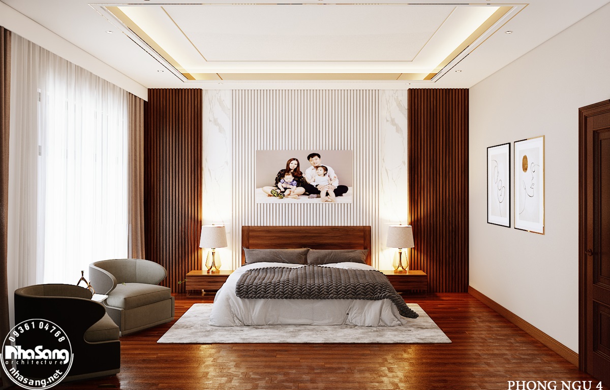 Với không gian nội thất phòng ngủ khá rộng này, KTS sử dụng ốp vách tường đầu giường gỗ tự nhiên là một lựa chọn khá quen thuộc trong các phong cách truyền thống và hiện đại. Ốp vách gỗ đầu giường đem tới sự ấm áp, bổ sung thêm hơi thở tự nhiên vào không gian. Giúp gia chủ cảm thấy gần gũi với không gian riêng tư của mình để có thời gian nghỉ ngơi thoải mái nhất.