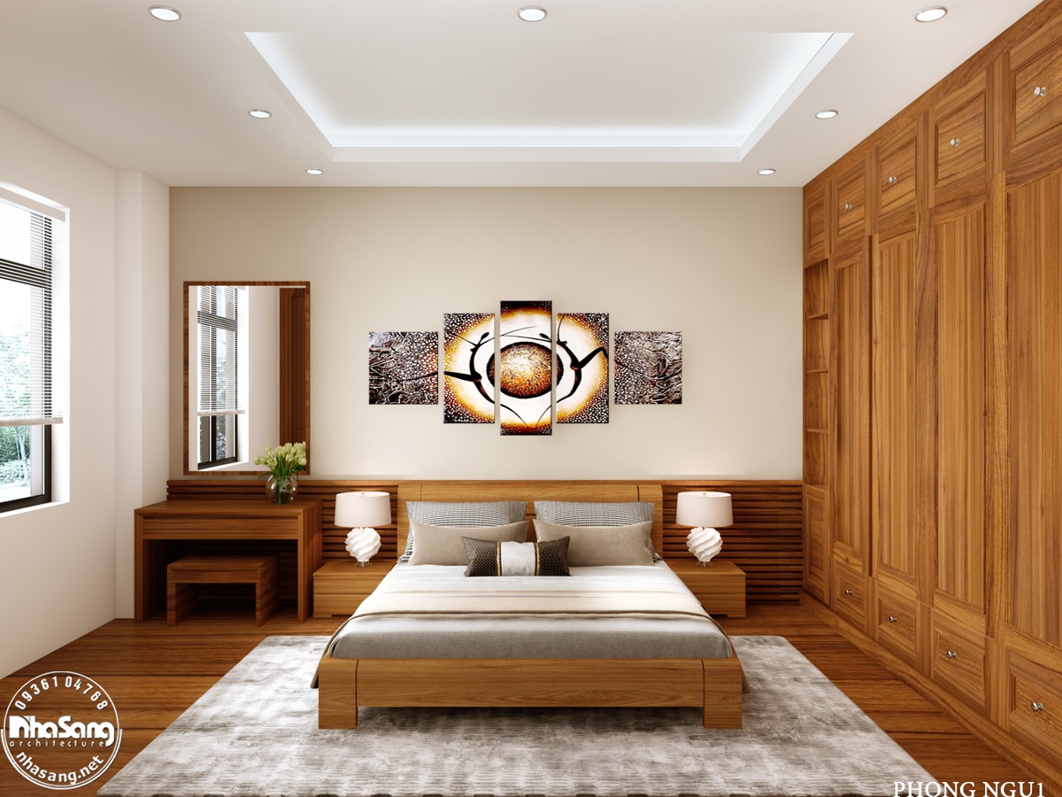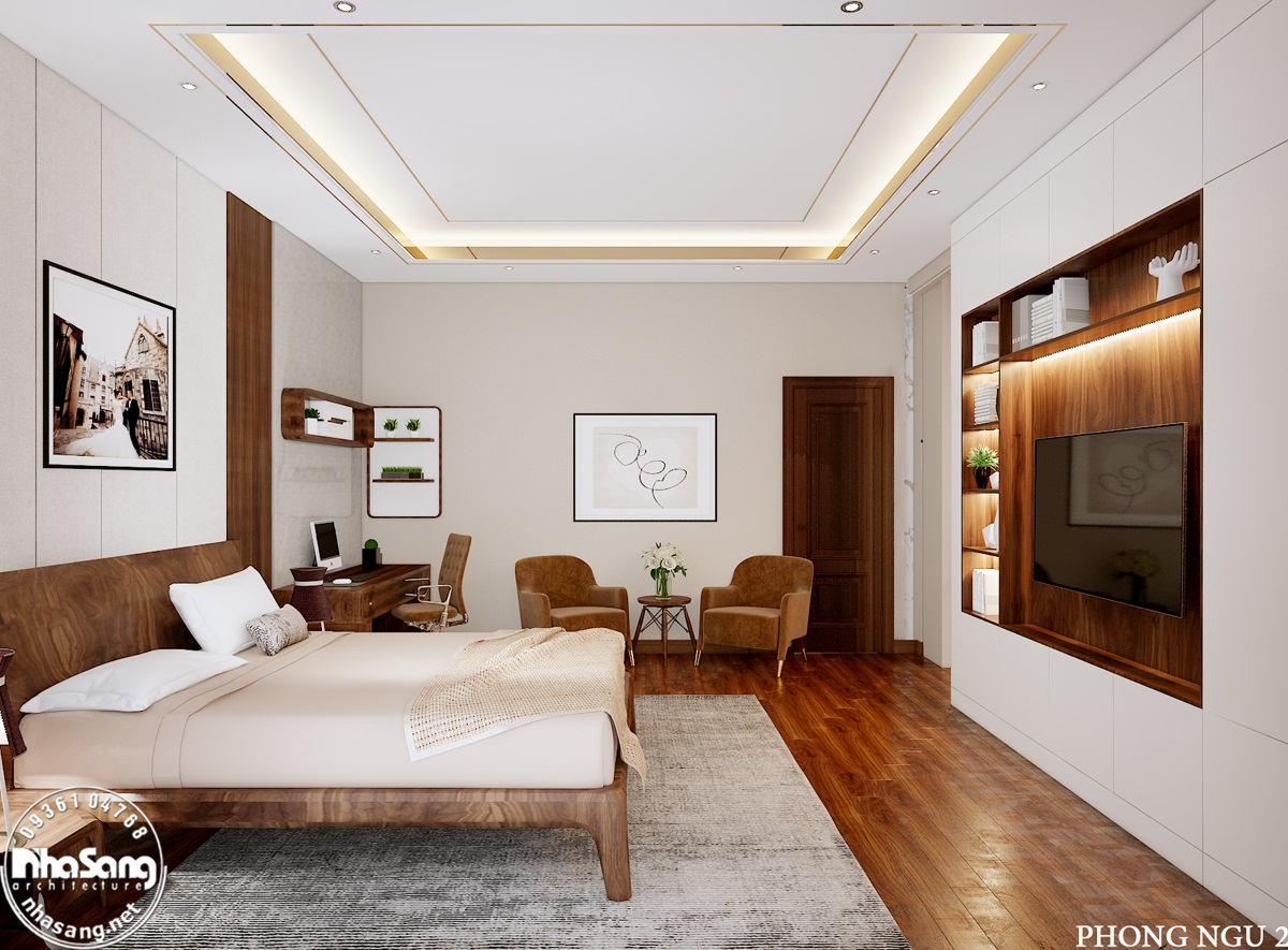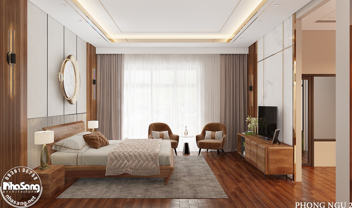 Với không gian nội thất phòng ngủ khá rộng này, KTS sử dụng ốp vách tường đầu giường gỗ tự nhiên là một lựa chọn khá quen thuộc trong các phong cách truyền thống và hiện đại. Ốp vách gỗ đầu giường đem tới sự ấm áp, bổ sung thêm hơi thở tự nhiên vào không gian. Giúp gia chủ cảm thấy gần gũi với không gian riêng tư của mình để có thời gian nghỉ ngơi thoải mái nhất.