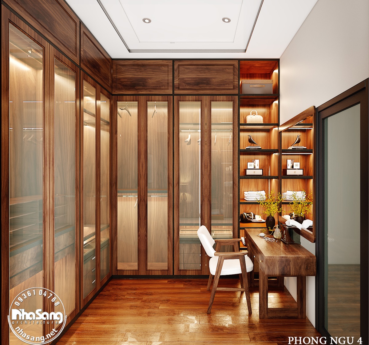 Phòng thay đồ thiết kế đơn giản chỉ gồm tủ quần áo sử dụng chất liệu gỗ kết hợp cánh kính thế nhưng không gian này lại được tối ưu mang lại sự tiện dụng với khu lưu trữ đồ tối đa cho gia đình.