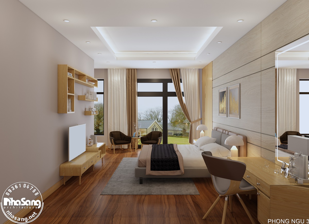 Cửa lùa khung nhôm kính phòng ngủ view rộng mở nhìn ra sân vườn thư giãn tuyệt vời