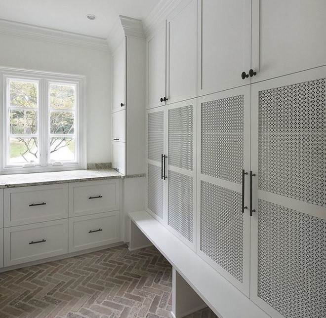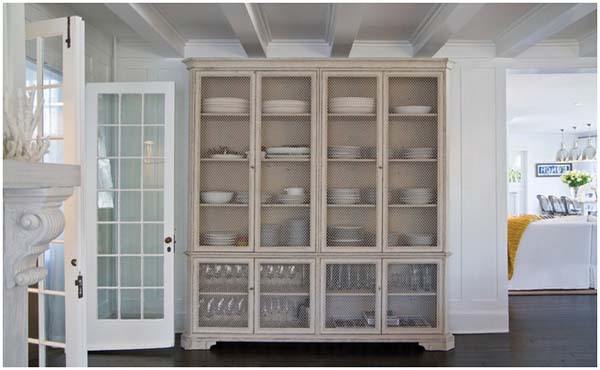 Nếu bạn có sưu tầm những bộ bát đia, chén ly đẹp muốn trưng bày trong phòng bếp một cách độc đáo mang cá tính riêng thì hãy thay những tủ gỗ có hệ cửa pano gỗ hoặc kính thông thường bằng hệ tủ gỗ cửa lưới. Mắt lưới có thể to hoặc nhỏ tủy sở thích. Chắc chắn phòng bếp sẽ rất điệu đà xinh xắn.