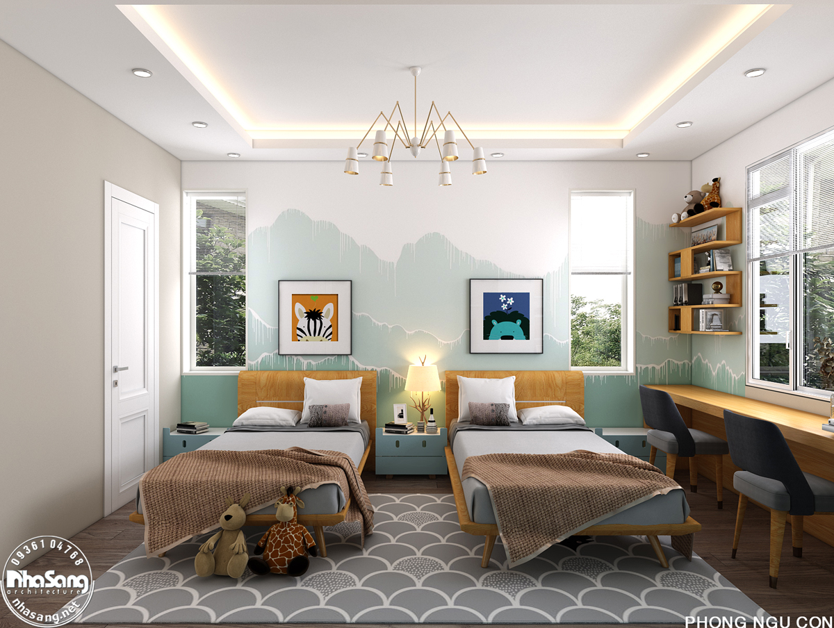 Phòng ngủ của 2 bé đồng thời kết hợp phòng học tập chung. Gia chủ có thể tham khảo đặt các vật dụng trang trí màu xanh dương đậm trong khu vực học tập, vừa giúp thư giãn trí óc, vừa là “nguồn sức mạnh” cho sự linh hoạt và phát triển không ngừng của mệnh Mộc. Tuy nhiên, lạm dụng quá nhiều màu sắc này sẽ khiến căn phòng trở nên lạnh lẽo. Vì vậy, chủ nhà cần khéo léo kết hợp cùng các gam màu khác như màu trắng, ghi sáng để cân bằng năng lượng cho không gian.