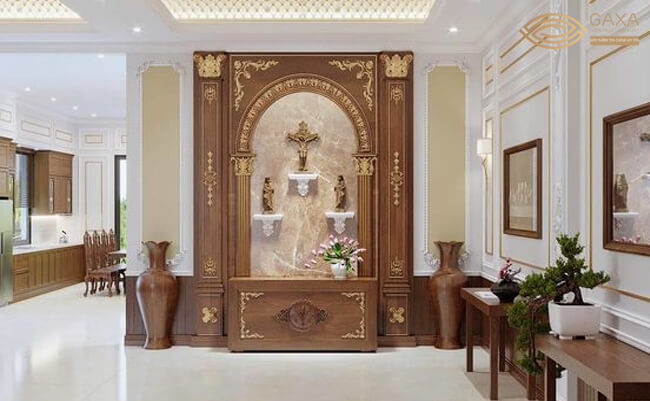 Tùy thuộc diện tích phòng khách mà gia chủ có thể chọn bàn thờ cho phù hợp. Nếu phòng khách quá nhỏ không gian hẹp thì đặt bàn thờ trên cao. Còn diện tích đủ lớn thì nên có một khoảng riêng có vách ngăn để làm gian thờ Chúa.