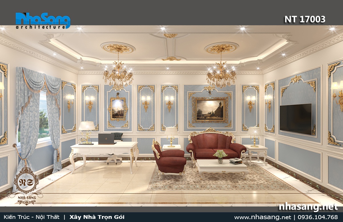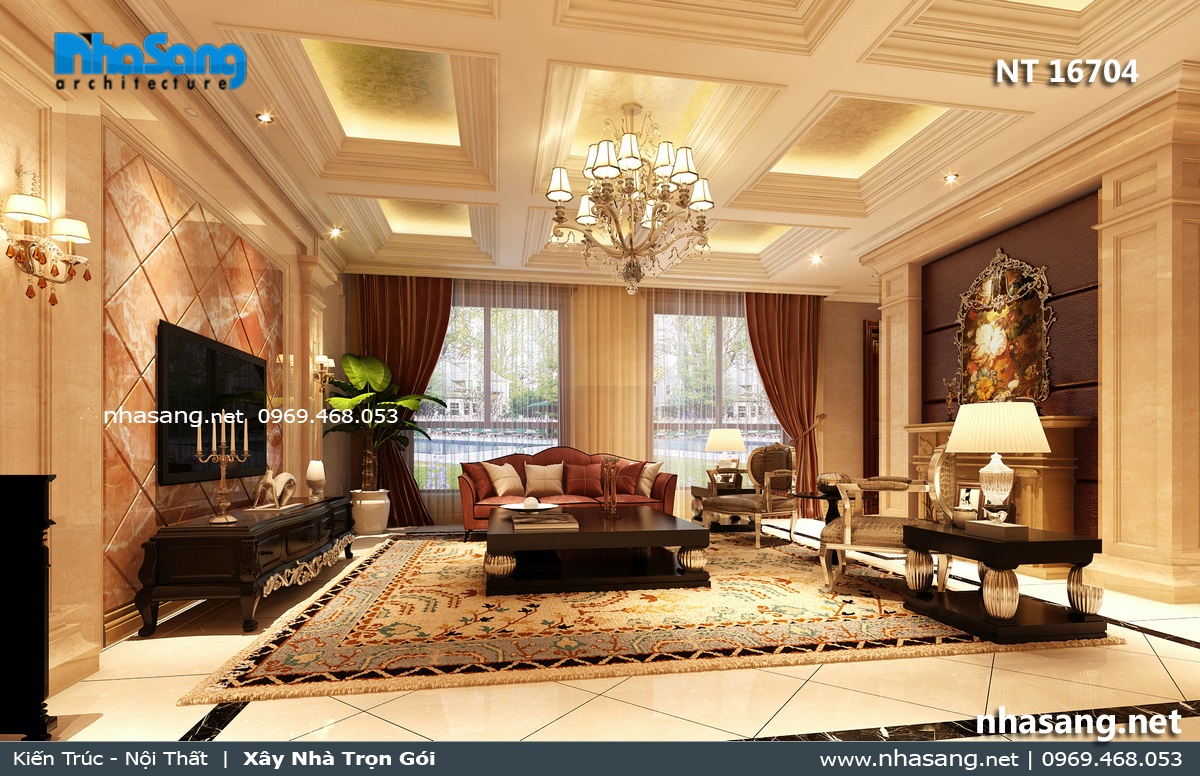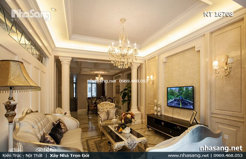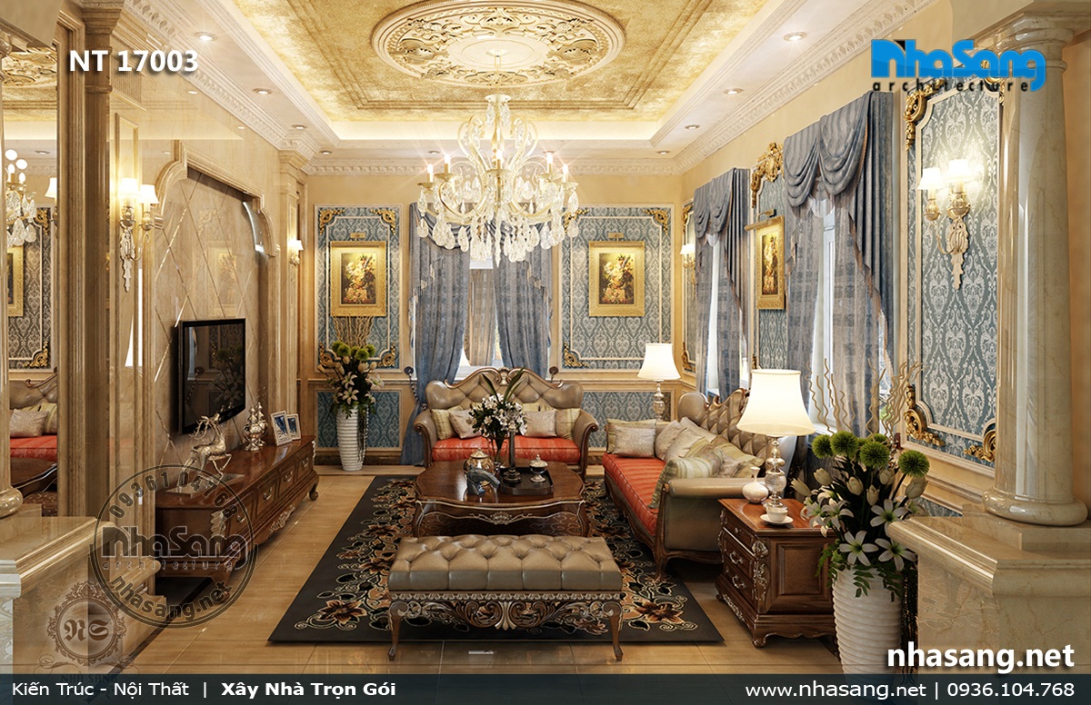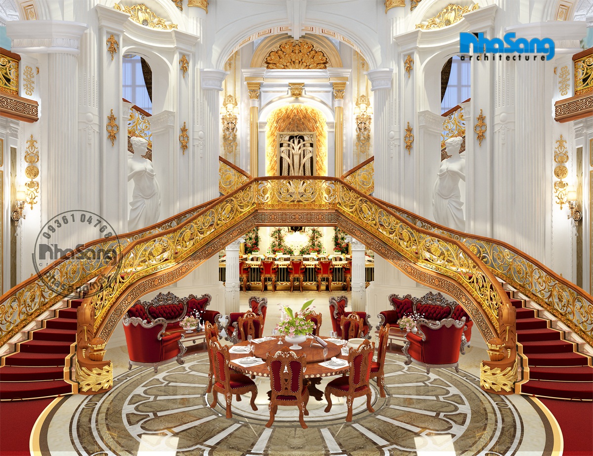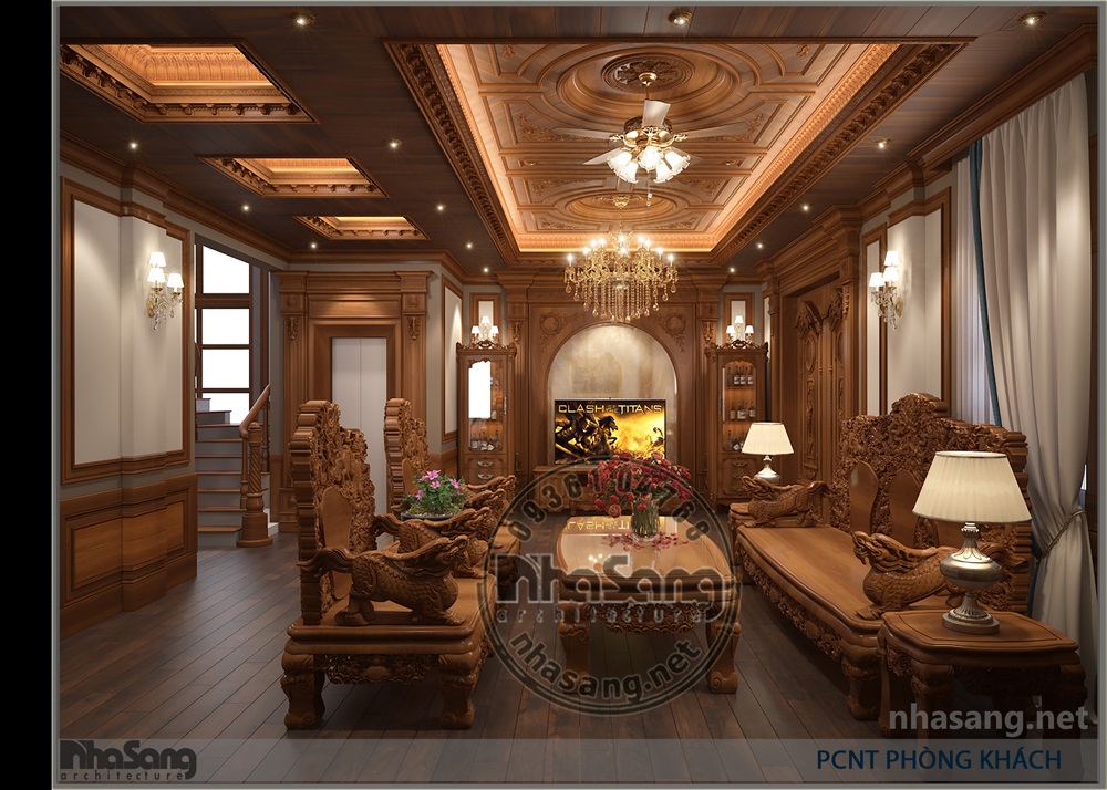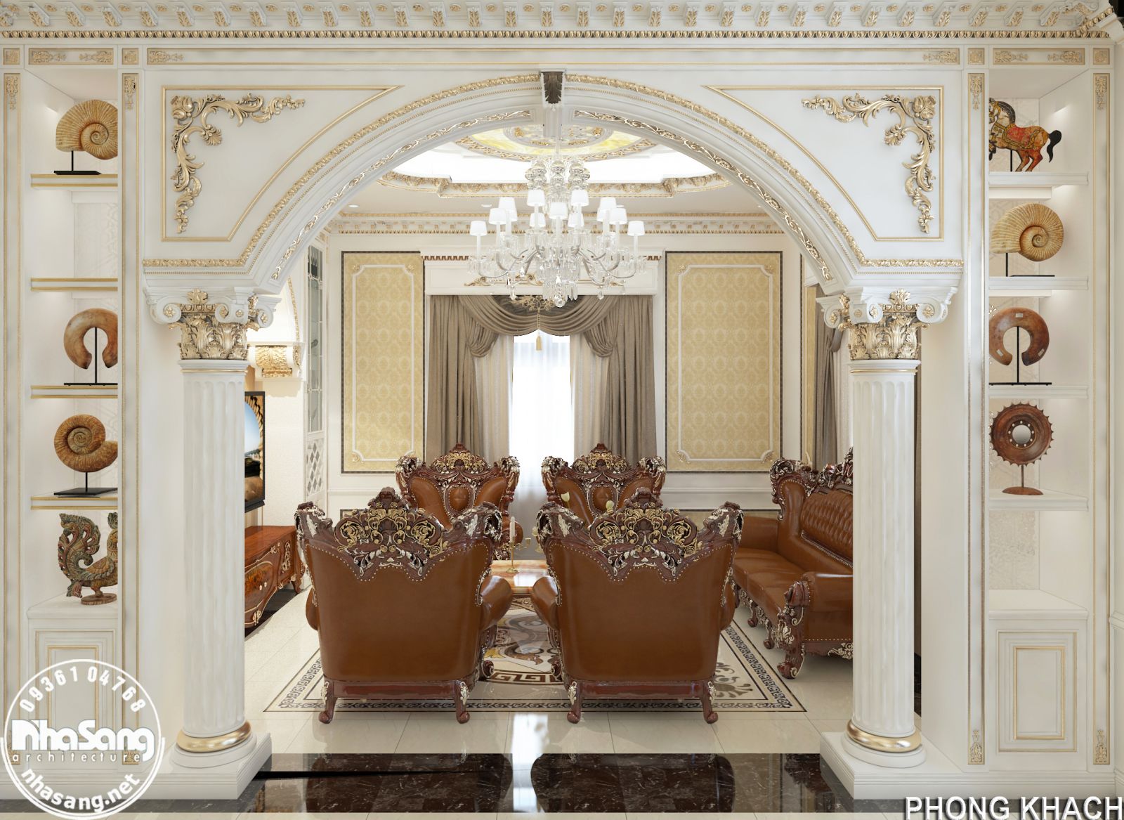 Nội thất phòng khách 36m2 phong cách hoàng gia đồ gỗ dát vàng sang trọng