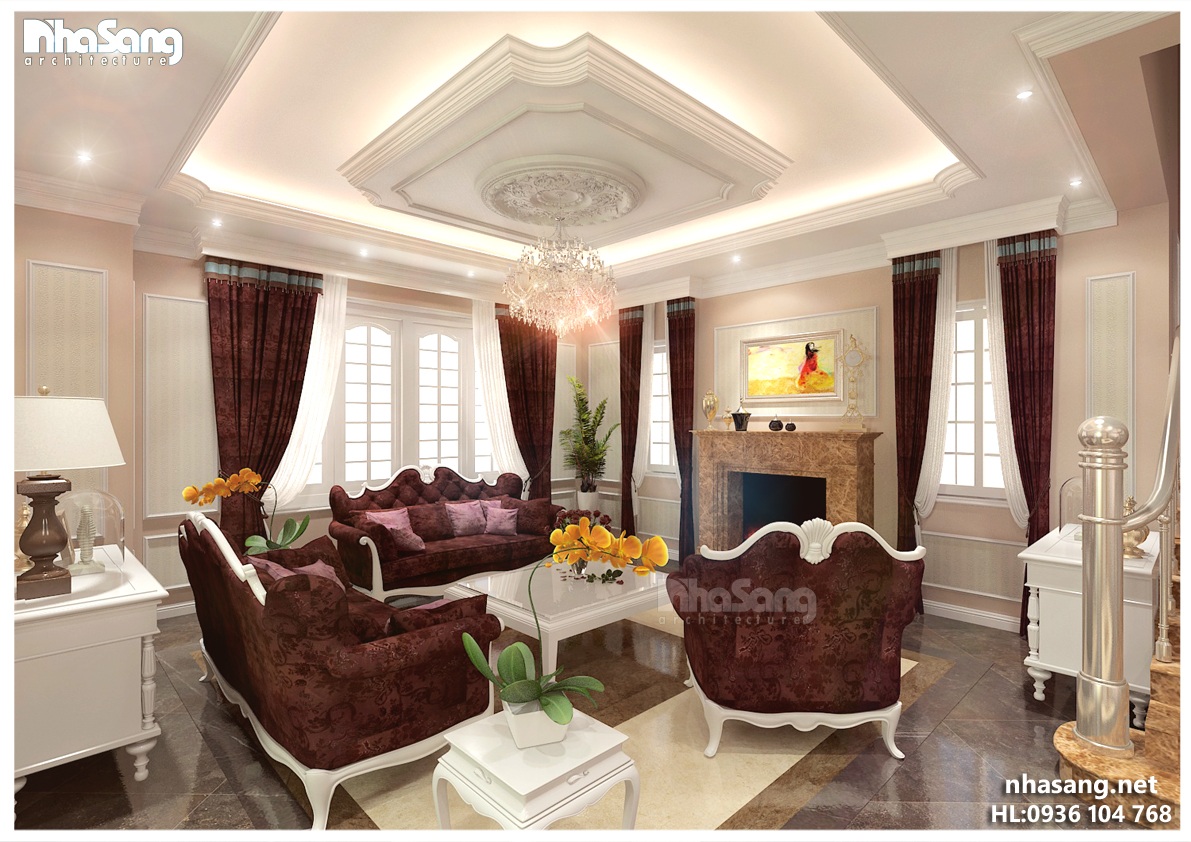 Nội thất phòng khách tân cổ điển Châu Âu màu đỏ đô hút tài chiêu lộc cho người mệnh hỏa