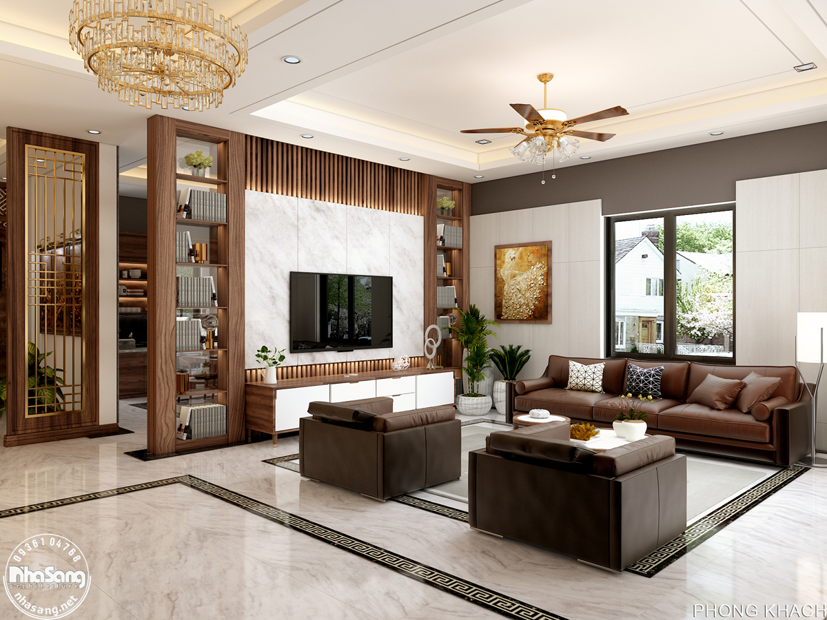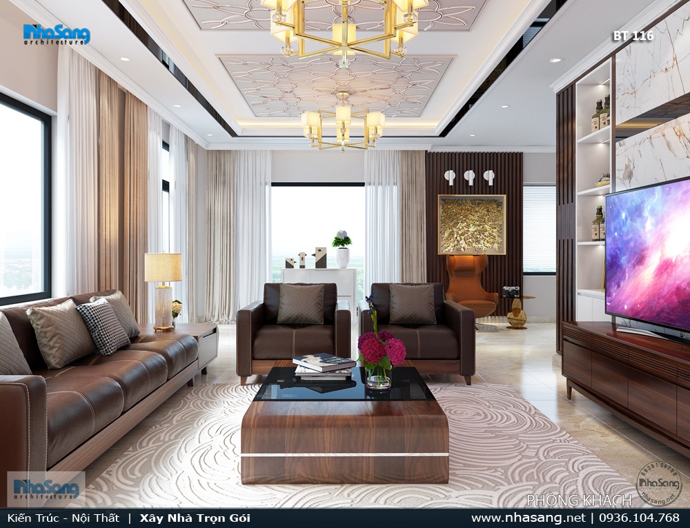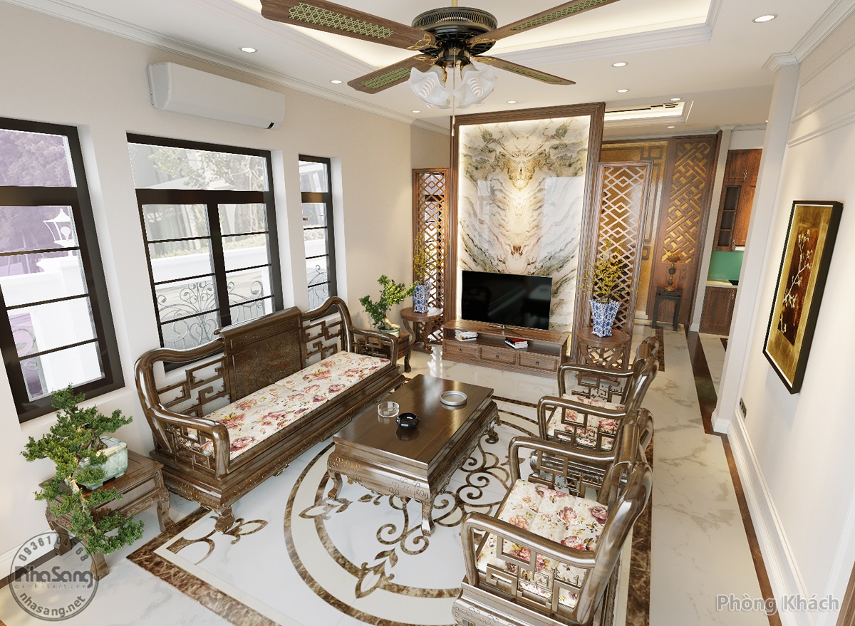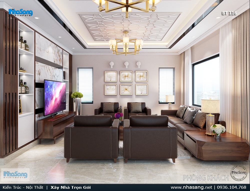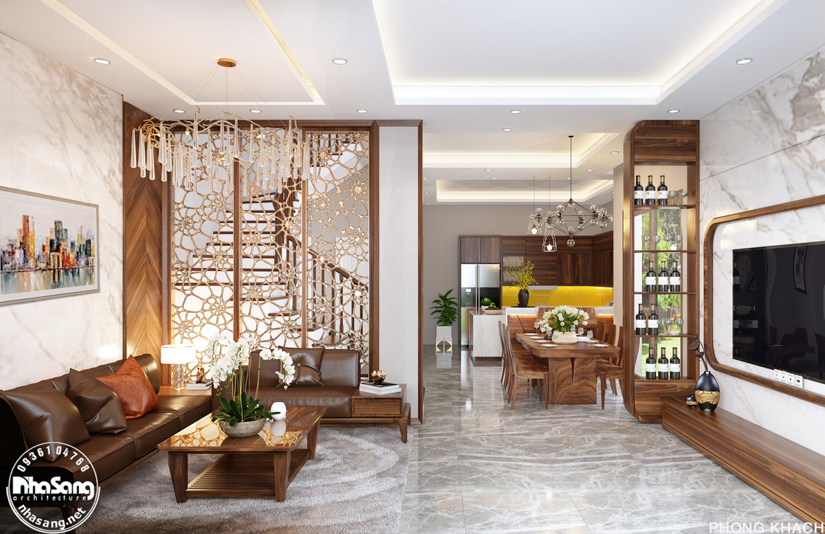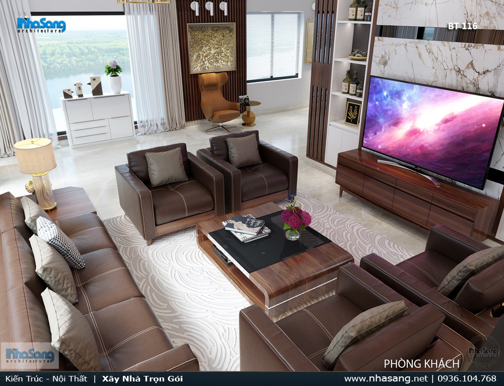 Dựa trên bản vẽ thiết kế nội thất và sự giúp sức đồng hành của kiến trúc sư, gia chủ có kế hoặc mua sẵn hoặc đặt đóng đồ nội thất gỗ đảm bảo tiến độ công trình và mua sắm có kiểm soát những đồ dùng cần thiết. Khi lên phương án thiết kế nội thất phòng khách, kiến trúc sư đã nghiên cứu kỹ sự hài hòa giữa thẩm mỹ kiến trúc với các yếu tố phong thủy.