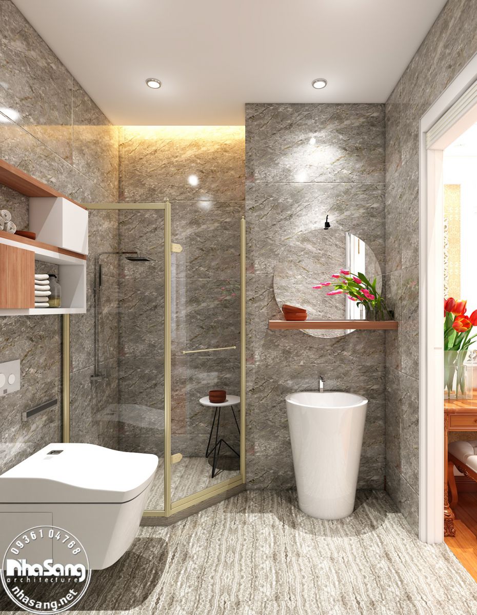 Mẫu thiết kế nhà hiện đại thường cố gắng tận dụng không gian để làm một nhà vệ sinh trong phòng ngủ khép kín. Tùy vào diện tích căn phòng ngủ mà gia chủ có thể đầu tư thêm nhiều không thư giãn gian nghệ thuật hoặc đồ nội thất đắt tiền khác cho phòng tắm thêm sang trọng đẳng cấp. Hoặc chỉ cần đáp ứng các yêu cầu cơ bản của một phòng tắm đơn giản như chậu lavabor rửa mặt, gương soi, vòi sen, xí bệt. Một nhà vệ sinh trong phòng ngủ loại cao cấp hơn có thể trang bị thêm bồn tắm nằm, bồn sục jacuzza, phòng xông hơi khô/ướt, phòng massage thư giãn... Một nhà vệ sinh trong phòng ngủ khép kín mang đến sự tiện lợi, đáp ứng nhu cầu sử dụng của gia chủ.