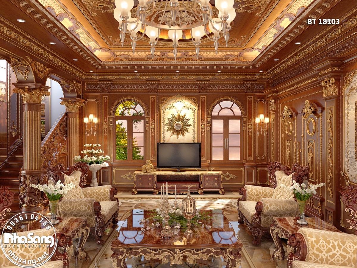 Mẫu tủ kệ tivi làm từ gỗ đinh hương đắt giá, thiết kế hầm hố với chân tủ đục hình đầu lân, mặt bàn đá marble dày dặn tạo cảm giác khỏe khoắn. Tủ kệ tivi hình khối chữ nhật đơn giản với 4 ngăn tủ. Tại vị trí các cột chia ngăn đều đục nổi hoa văn hoàng gia cầu kỳ và được dát vàng cầu kỳ. Mẫu tủ kệ tivi phù hợp với những biệt thự có không gian phòng khách rộng rãi. Nội thất kiểu hoàng gia cầu kỳ đem lại cảm nhận vương giả, chiêu mời tài lộc cho gia chủ.