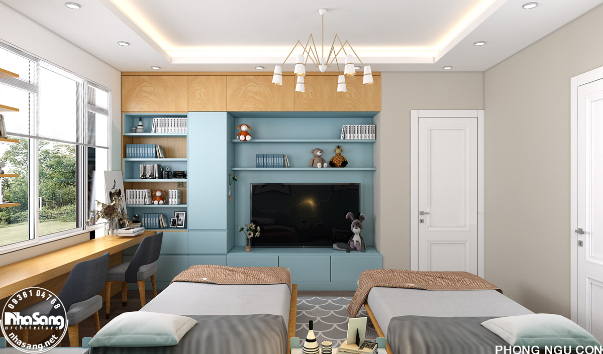 Bé trai thường tinh nghịch hiếu động nên đồ đạc nội thất phòng ngủ nên ưu tiên phong cách đơn giản. Có thể thấy các đồ nội thất thường là gỗ với bề mặt không trang trí phụ kiện gì ngay cả tay nắm mở tủ cũng giản lược tối đa. Giường ngủ kiểu phản kê đệm. Bàn học cho 2 bé trai là tấm gỗ nguyên khối đơn giản chắc bền. Tủ full trần vừa có chức năng của kệ đặt tivi, vừa có chức năng làm giá sách và các ngăn kéo khác để đồ chơi, thiết bị học tập hay chăn màn, quần áo. Với sức chứa đồ như vậy thì tủ tường kiêm kệ tivi này đã giúp cho căn phòng trở nên gọn gàng và ngăn nắp hơn rất nhiều. Tủ kệ tivi gỗ tự nhiên sơn xanh mint tạo cảm giác tươi mới, tinh nghịch chắc chắn sẽ thu hút các bé trai.