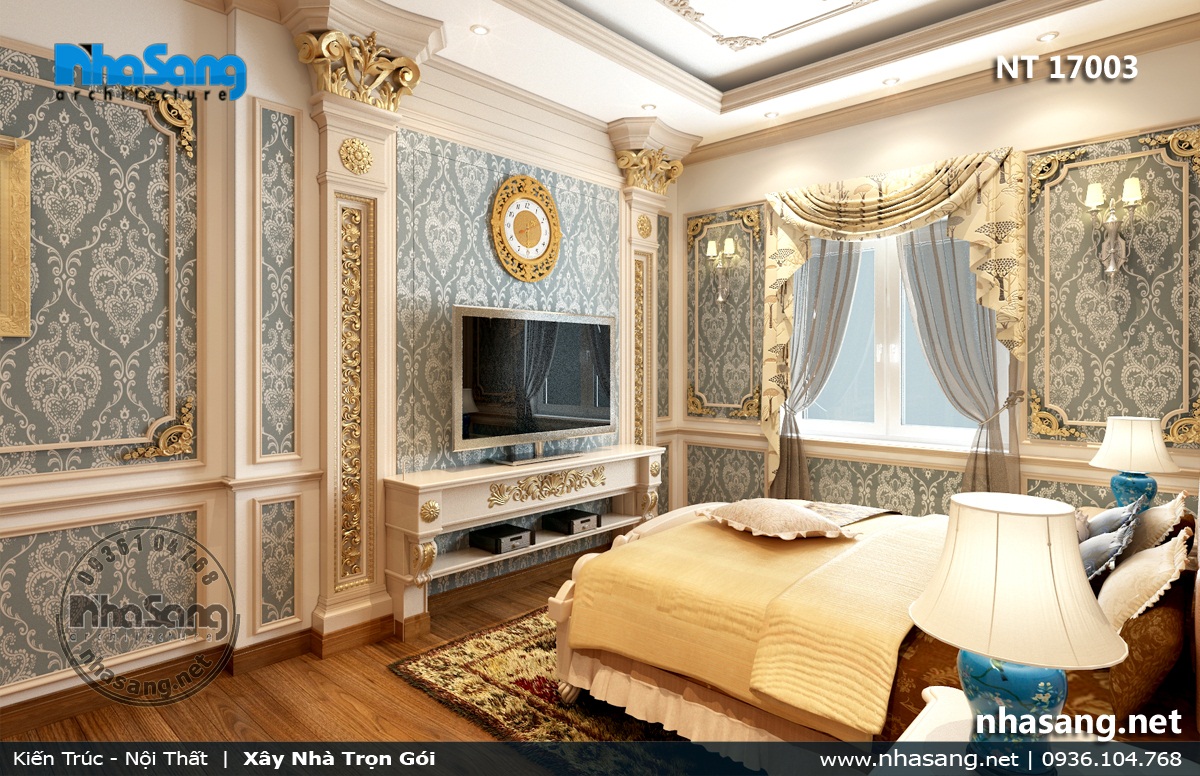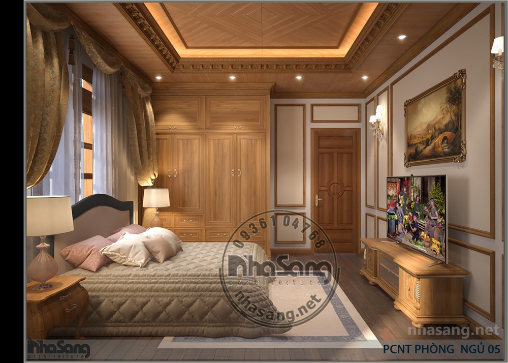 Gỗ đinh hương là loại gỗ tự nhiên quý hiếm với tính thẩm mỹ tuyệt vời. Vì thế, gia chủ nào cũng muốn sở hữu nội thất từ gỗ đinh hương, kể cả kệ tivi. Đối với phòng ngủ tân cổ điển phong cách thanh lịch quý phái này, kệ tivi cũng thiết kế khác đơn giản. Chủ yếu nét đẹp toát lên từ những vân gỗ quý tự nhiên sẵn có. Chỉ nhấn nhá thêm phụ kiện mở ngăn kéo bằng đồng tạo thêm sự sang trọng. Thiết kế mang nét đẹp tân cổ điển đầy uy nghi mà nhã nhặn. Phía sau tivi tường được dán giấy cao cấp hoa văn hoàng gia và gia công thêm viền bo thạch cao. Nhìn tổng thể khu vực tivi hài hòa và cân đối về bố cục, thẩm mỹ.