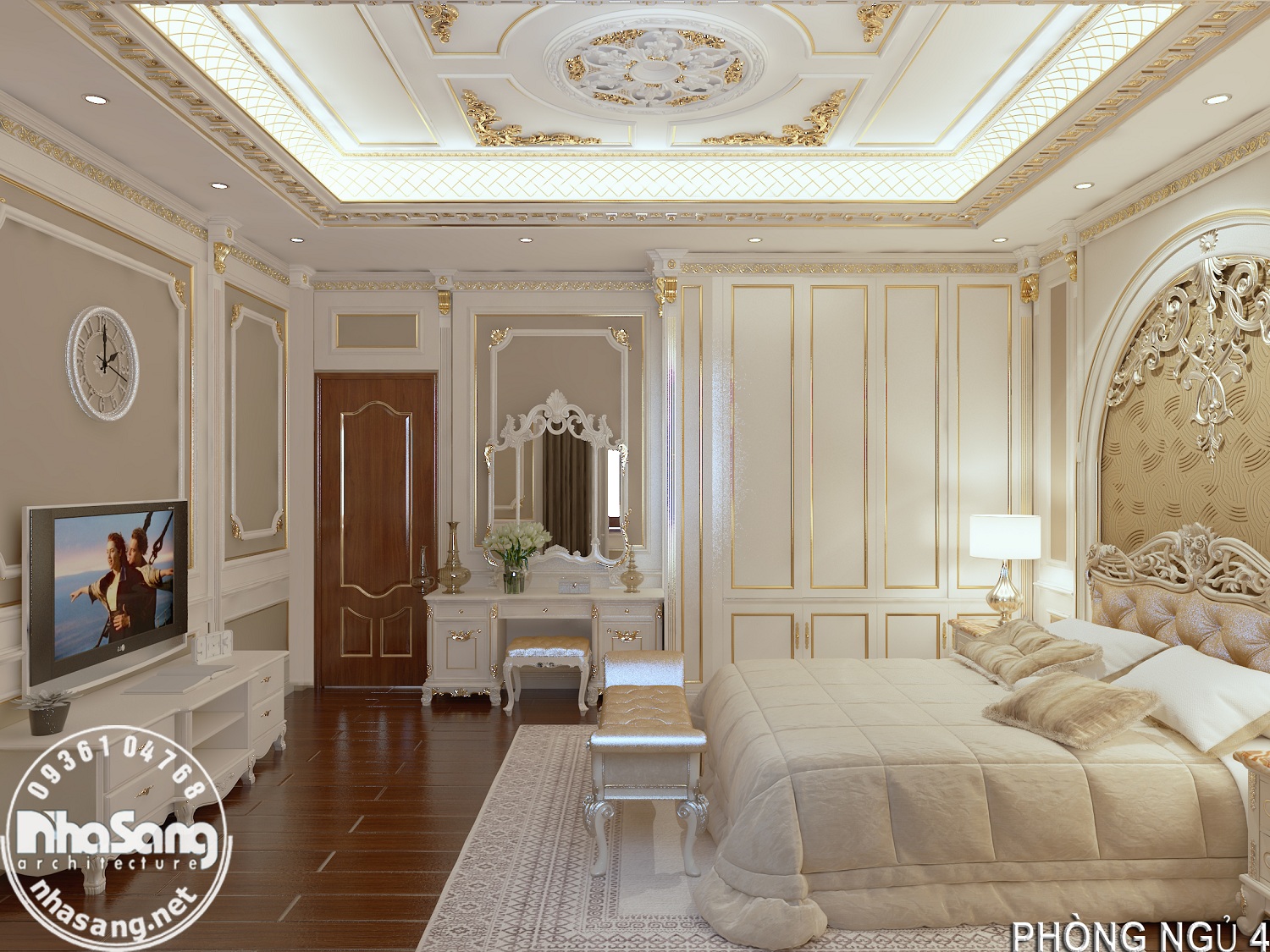 Ngoài giường ngủ là đồ nội thất thiết yếu của phòng ngủ thì khu vực tivi thu hút sự tập trung chú ý của người ở nhiều nhất. Trang trí mảng tường sau tivi sang chảnh và đúng gout sẽ tạo sự thoải mái thích thú cho gia chủ. Kệ tivi trên là một trong các mẫu tủ kệ sang chảnh dành cho phòng ngủ thượng lưu. Vật liệu chính là gỗ gõ đỏ Lào và da bò Italia thượng hạng khiến người thưởng thức như đắm chìm vào không khí lâu đài Châu Âu cổ kính. Phía sau chiếc tivi chủ nhà thường đầu tư thiết kế ánh sáng. Những miếng kim loại mạ đồng bo viền xung quanh tấm da trắng ngà, khi được hắt đèn phòng ngủ vào tạo hiệu ứng khúc xạ ánh sáng lung linh. Cách thiết kế này vừa để trang trí cho không gian phòng khách sáng lên vừa đảm bảo tập trung vào được vị trí sang trong nhất của phòng ngủ. Phòng ngủ là không gian riêng tư của gia chủ nhưng cũng là để khoe sự giàu có, đẳng cấp, gu thẩm mỹ của chủ nhà.