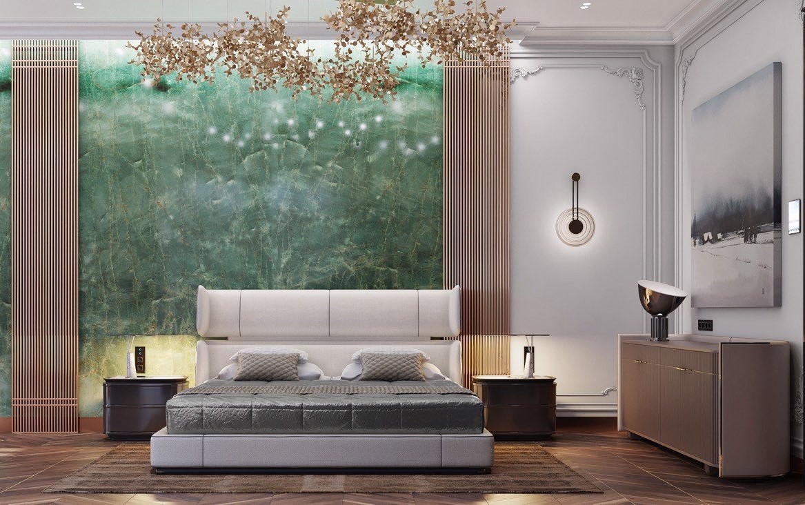 Phòng ngủ là nơi nghỉ ngơi và thư giãn nên được ưu tiên cho những điều mộc mạc và dễ chịu nhất. Phòng ngủ được trang bị toàn những đồ nội thất hoàng gia cao cấp tạo cảm giác lịch sự, quý phái khá nhàm chán và thô cứng. Đưa một chút các yếu tố thiên nhiên vào không gian này sẽ dễ dàng đi vào giấc ngủ yên bình. Đầu giường được trang trí 2 khối lam gỗ full tường và một bức tranh đá màu ngọc bích tuyệt đẹp, tổng thể như một bức tranh khu rừng trừu tượng vừa sang trọng vừa mát mắt.