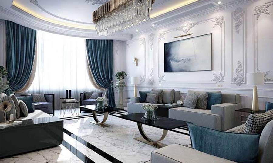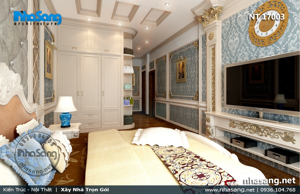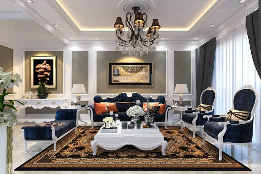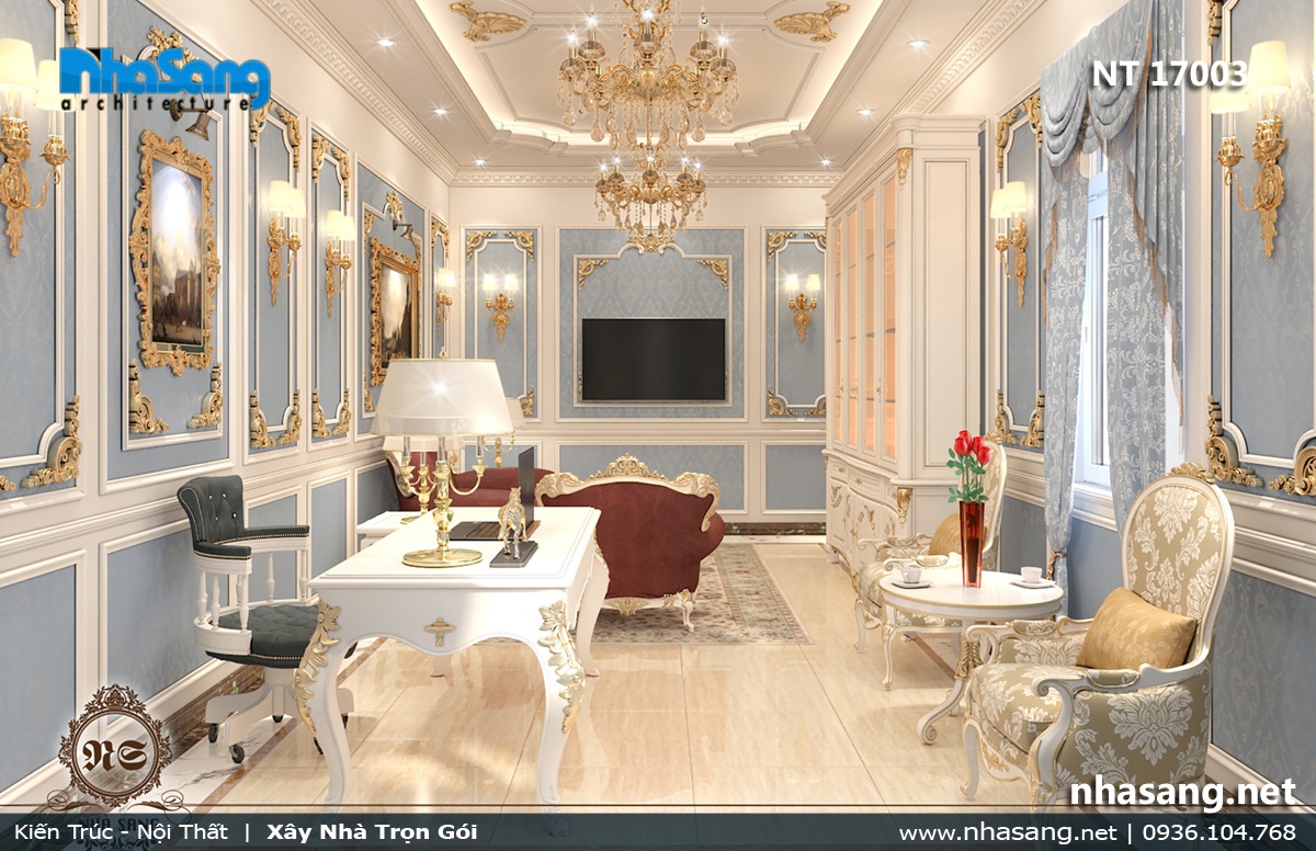 Phòng làm việc là nơi đầu tư phần lớn chất xám của gia chủ để tạo ra của cải vật chất cho cả gia đình. Vậy nên phòng làm việc rất cần được đầu tư nội thất xứng đáng với công sức của người chủ. Không gian làm việc cần nhất là yên tĩnh để tập trung suy nghĩ, sau đó đến mặt thẩm mỹ nhằm thư thái tinh thần để đưa ra được quyết định chính xác nhất. Nội thất phòng làm việc với bàn ghế, sofa bàn trà thiết kế theo phong cách tân cổ điển hoàng gia đem đến cảm nhận về sự giàu có, thu hút tài lộc. Màu xanh lam nhẹ nhàng chiếm vị trí chủ đạo, kết hợp màu sắc của ánh sáng cùng với những tông màu nổi bật để tạo ra một phông nền đầy cảm hứng cho bất kì hoạt động nào.
