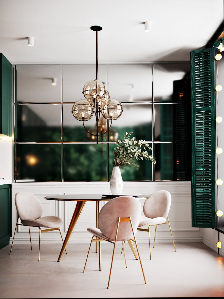 Màu xanh lá cây là một tone màu rất linh hoạt, vừa có thể được dùng trong thiết kế nội thất biệt thự tân cổ điển mang tính chất sang trọng. vừa được dùng trong nội thất hiện đại tạo sự tươi trẻ. Dưới đây là một ví dụ màu xanh lá cây được ứng dụng trong thiết kế nội thất phòng bếp ăn cho biệt thự phong cách tân cổ điển và phòng bếp ăn hiện đại. Dù dùng trong hoàn cảnh nào màu xanh lá cây vẫn rất trendy và hút mắt người nhìn.