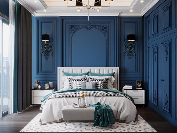 Màu xanh dương được tỏa sáng khi kết hợp cùng sơn tường hoặc đồ nội thất màu sáng như màu trằng, màu nâu gỗ, hoặc nhấn nhá một chút màu đỏ tạo sự cá tính, hoặc các màu tối hơn như ghi hoặc đen tạo sự tương phản. Nội thất màu xanh dương lấy cảm hứng từ vẻ đẹp của Trái Đất và những bãi biển tuyệt đẹp. Không gian nhà ở dùng nhiều đồ nội thất màu xanh dương tạo cảm giác thanh mát, yên bình. Bộ bàn ghế sofa phòng khách vải nỉ xanh lam đậm trẻ trung mà vẫn quyền uy. Phòng ngủ sơn tường màu xanh lam đậm rất mạnh mẽ hiện đại, có một chút huyền bí mê hoặc.