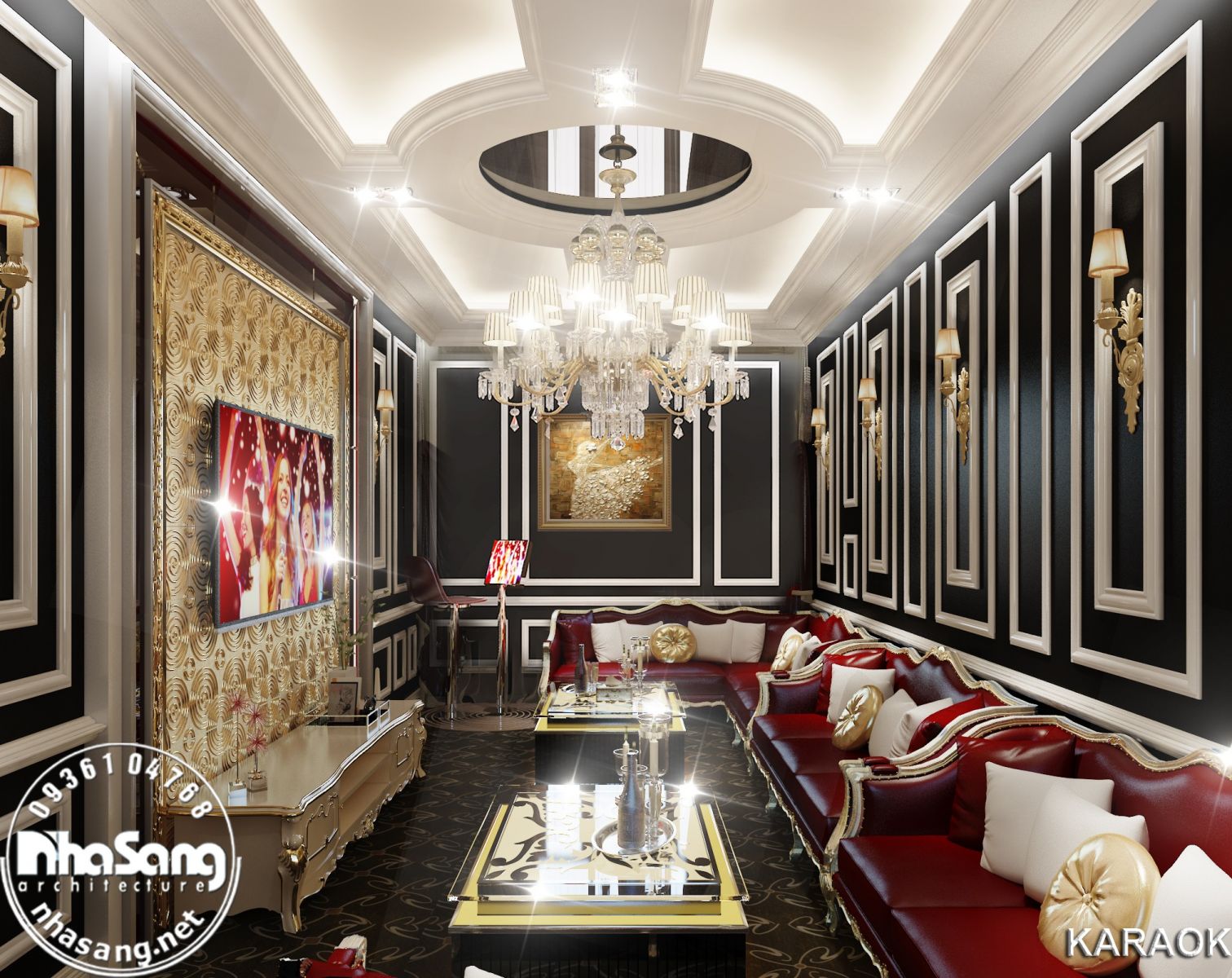 Phòng giải trí 16m2 được tính toán bố trí tối đa không gian sử dụng đồng thời lựa chọn các vật liệu cách âm một cách hợp lý, khoa học. Hệ thống ánh sáng trong phòng giải trí cũng hết sức quan trọng bởi với ánh sáng mạnh yếu khác nhau sẽ góp phần tạo nên được hiệu quả cho việc giải trí hơn. Nội thất phòng karaoke này chủ yếu sử dụng đèn trùm rủ và đèn chụp treo tường với ánh sáng mờ nhẹ nhàng tránh ánh sáng mạnh, chói mắt.