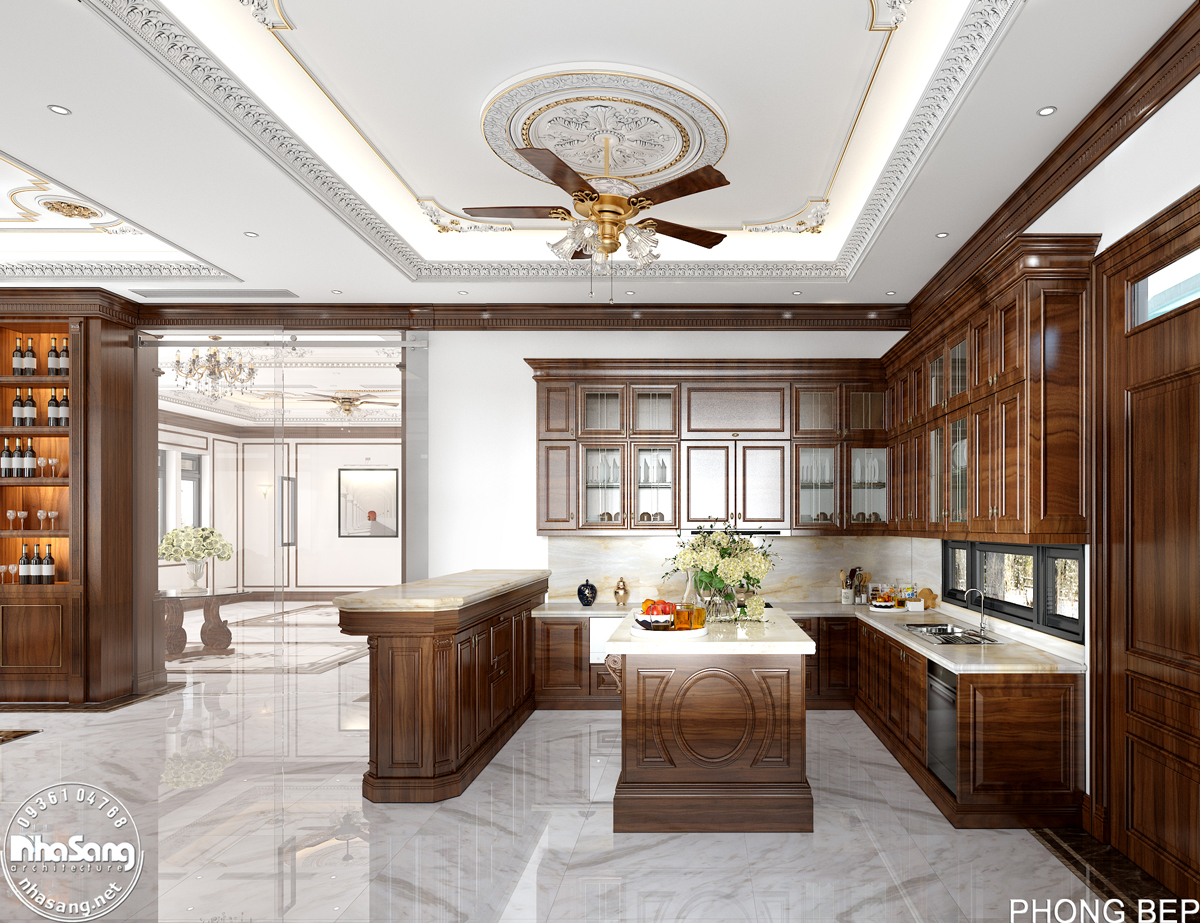 Đồ đạc nội thất biệt thự tân cổ điển cho Phòng bếp nấu 19.6m2 + Phòng ăn 32.5m2 bao gồm hệ tủ chạn gỗ pano kính, bàn đảo gỗ óc chó mặt đá marble, bàn bếp chữ U mặt đá marble vân mây, bàn ăn chữ nhật 10 ghế, tủ rượu âm tường gỗ óc chó.