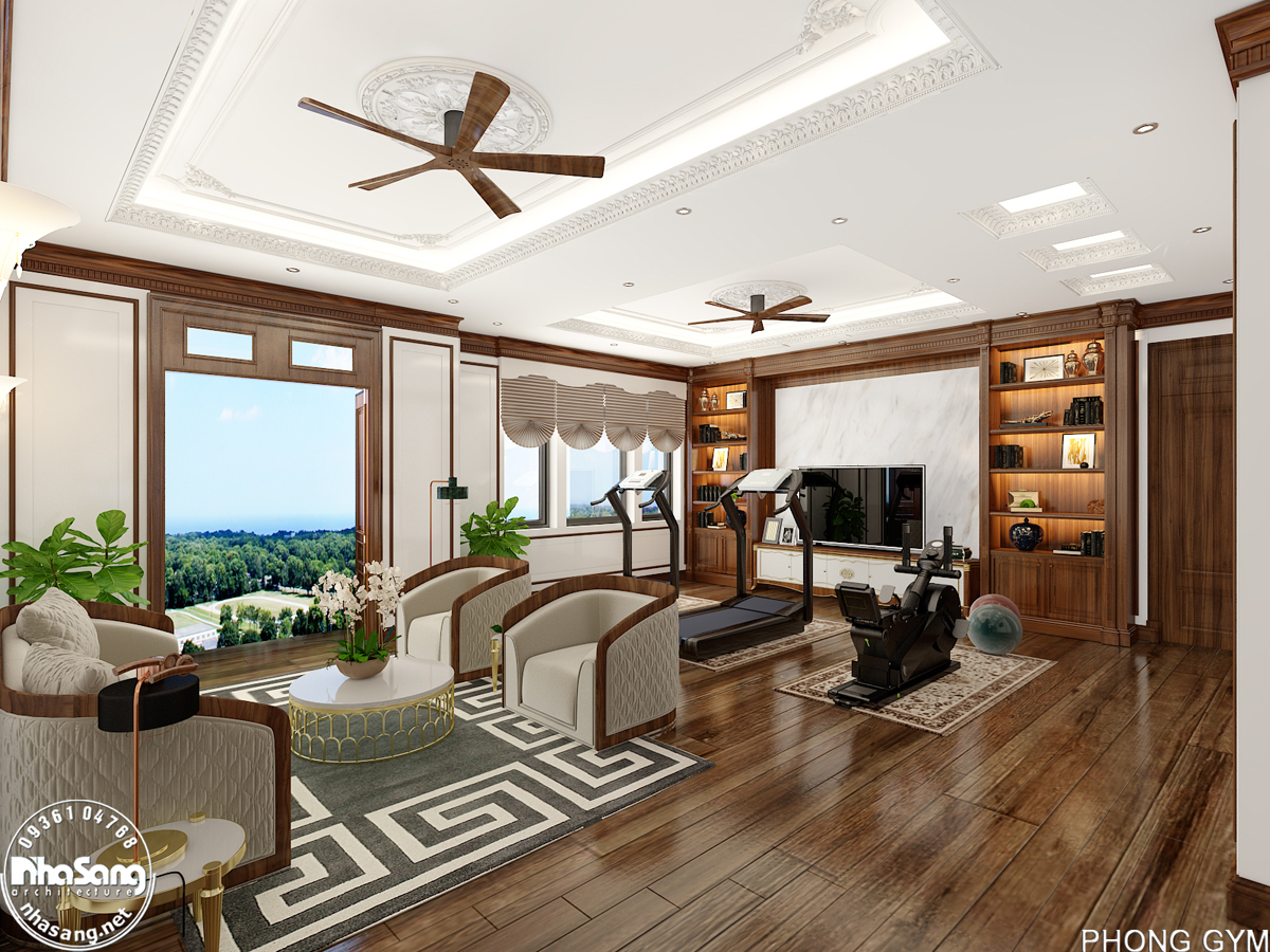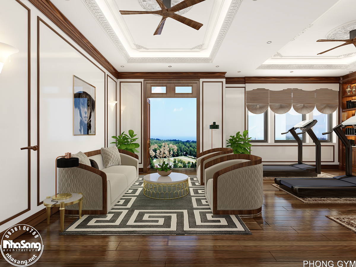 Thiết kế hoàn thiện nội thất phòng khách chủ yếu bằng gỗ óc chó có độ bền về màu sắc cao, và ít chịu ảnh hưởng bởi nhiệt độ quá nóng hay quá lạnh nên không bị co ngót cong vênh nhiều hay mối mọt. Không gian phòng khách từ đồ đạc nội thất đến các bức tường và cột đều được ốp gỗ óc chó, tràn ngập trong sắc nâu chocolate ấm áp. Thiết kế tân cổ điển đem đến cho không gian phòng khách nét đẹp mềm mại uyển chuyển quyến rũ rất quý tộc.
