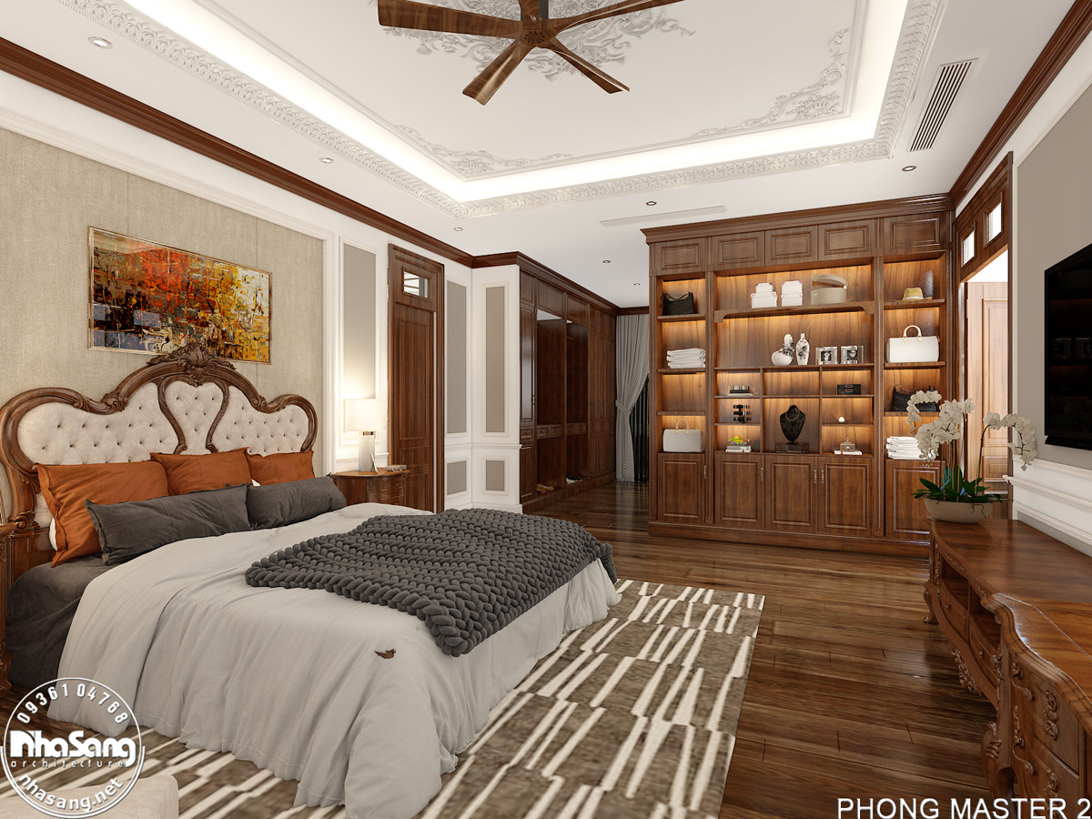 Để làm tôn lên vẻ đẹp của đồ nội thất gỗ tân cổ điển phòng khách biệt thự, không thể thiếu việc bố trí ánh sáng hợp lý. Phòng khách biệt thự này sử dụng hệ đèn hắt, đèn downlight, đèn chùm phale và cả quạt trần giả đèn tân cổ điển. Tạo hiệu ứng ánh sáng lung linh hơn so với ánh sáng trắng bình thường, hấp dẫn khách tham quan nhà. Cầu thang có diện tích khiêm tốn được đẩy lùi về phía sau nhà. Thiết kế cầu thang đơn giản với tay vịn và mặt bậc được ốp bằng gỗ óc chó. Cầu thang uốn lượn quay vào trong tiết kiệm diện tích, với thiết kế cách điệu bậc đầu loe rộng hơn và thu nhỏ dần lại bậc trên tạo cảm giác uyển chuyển.