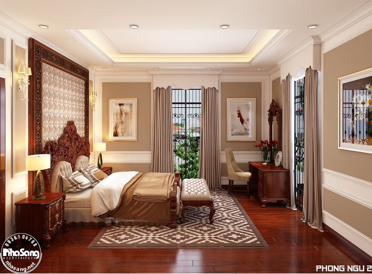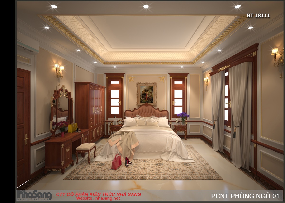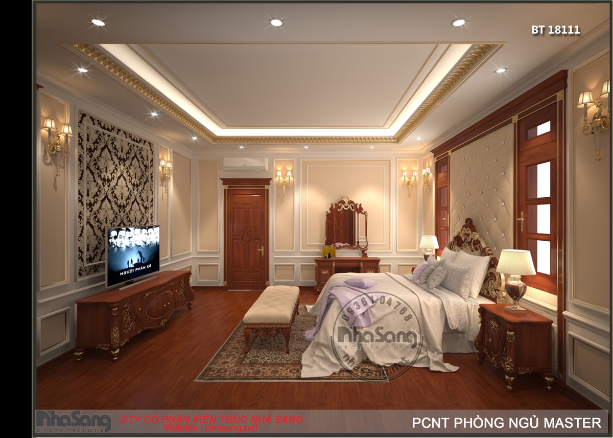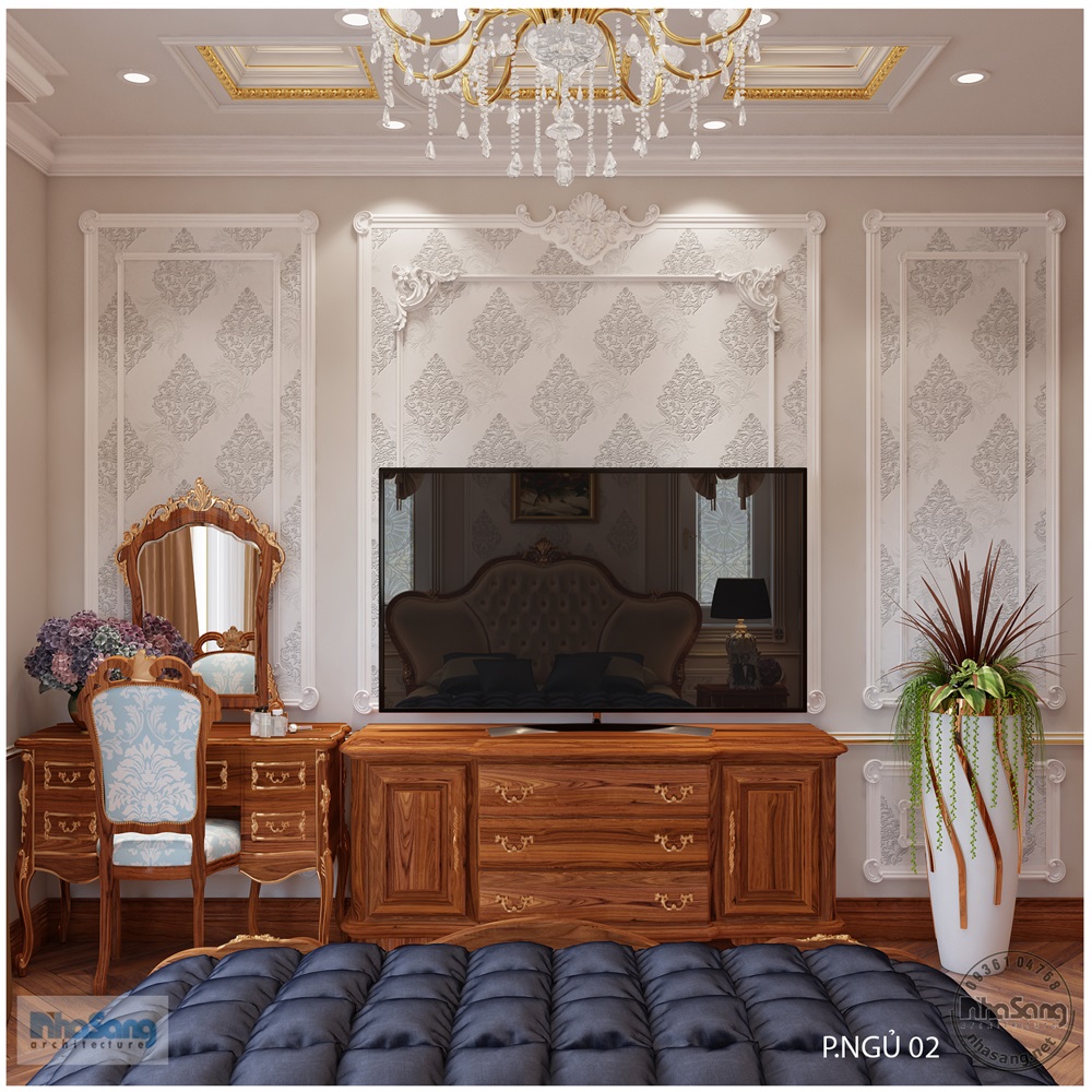 Nội thất phòng ngủ Master: Phòng ngủ master có diện tích 29m2, kích thước 6m x 5m; khu phụ gồm phòng thay đồ 8m2 và vệ sinh 9m2. Đối với một phòng ngủ sang trọng như này, thì bất cứ một vật dụng nội thất nào dù nhỏ nhất cũng phải sang trọng xứng tầm. Mẫu bàn phấn thiết kế kiểu tân cổ điển, làm từ gỗ gõ đỏ cao cấp, hoa văn đục tay tinh xảo. Điểm nhấn dát vàng tạo nên sự đắt giá của đồ nội thất. Chân bàn, chân ghế, và khung gương được thiết kế đục tay rất cầu kỳ, đường nét mềm mại quyến rũ. Mặt bàn đá marble sang trọng sạch sẽ. Mặt ghế bọc đệm mouse và nhung mềm mại nâng niu người sử dụng. Gương tráng bạc đắt giá nên hình ảnh phản chiếu rất chân thực tươi sáng giúp nạp thêm năng lượng tươi mới mỗi ngày cho chủ nhân.