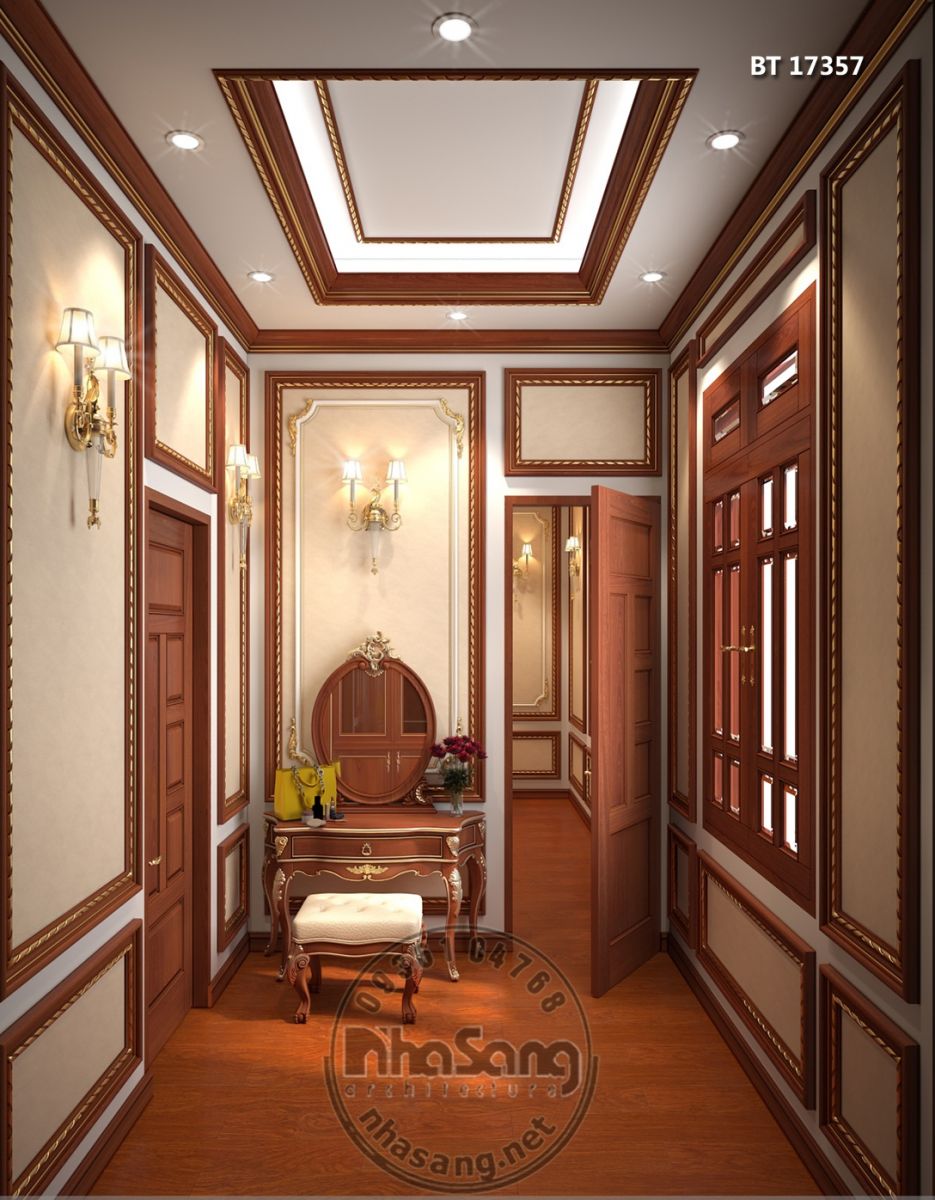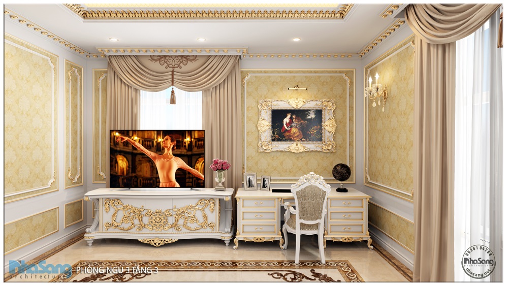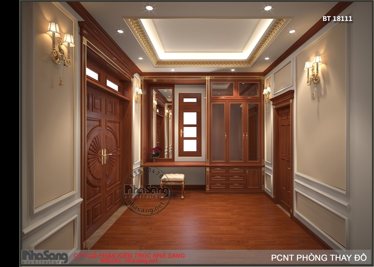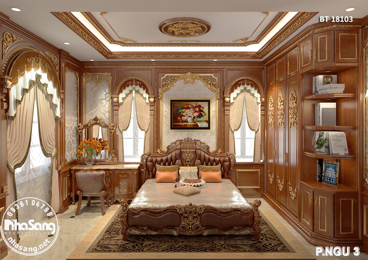 Nội thất phòng ngủ Master: Phòng ngủ master có diện tích 29m2, kích thước 6m x 5m; khu phụ gồm phòng thay đồ 8m2 và vệ sinh 9m2. Đối với một phòng ngủ sang trọng như này, thì bất cứ một vật dụng nội thất nào dù nhỏ nhất cũng phải sang trọng xứng tầm. Mẫu bàn phấn thiết kế kiểu tân cổ điển, làm từ gỗ gõ đỏ cao cấp, hoa văn đục tay tinh xảo. Điểm nhấn dát vàng tạo nên sự đắt giá của đồ nội thất. Chân bàn, chân ghế, và khung gương được thiết kế đục tay rất cầu kỳ, đường nét mềm mại quyến rũ. Mặt bàn đá marble sang trọng sạch sẽ. Mặt ghế bọc đệm mouse và nhung mềm mại nâng niu người sử dụng. Gương tráng bạc đắt giá nên hình ảnh phản chiếu rất chân thực tươi sáng giúp nạp thêm năng lượng tươi mới mỗi ngày cho chủ nhân.