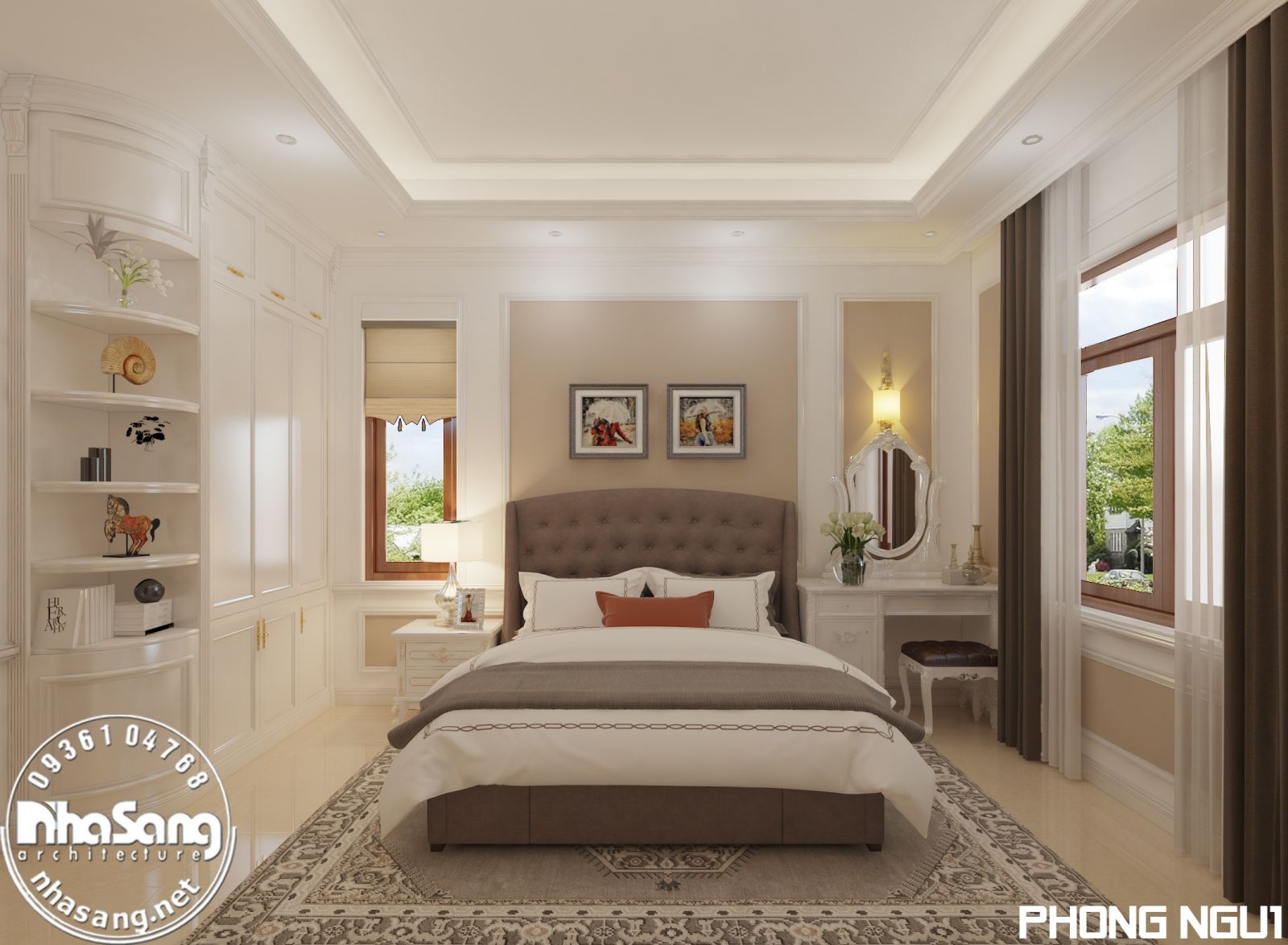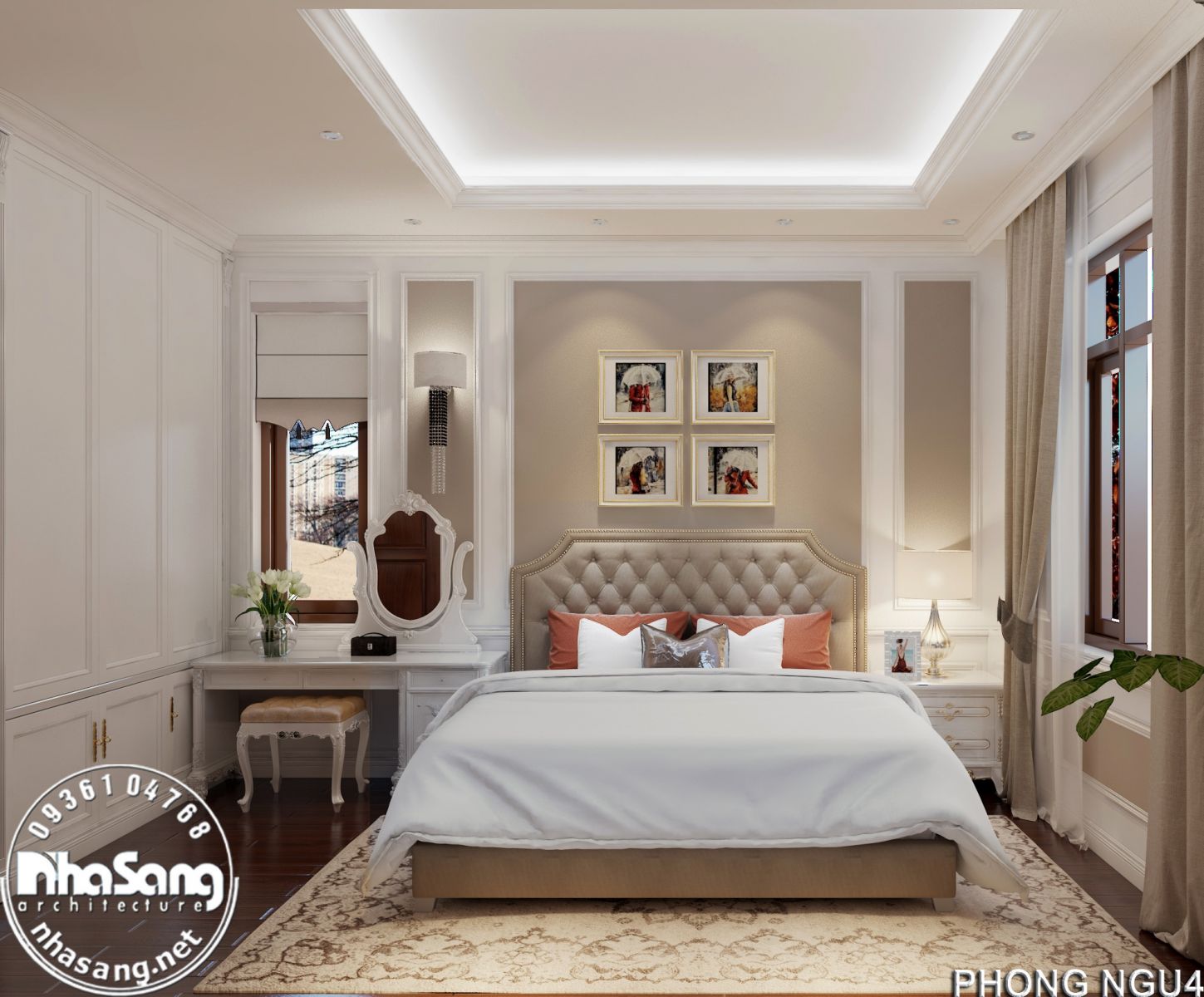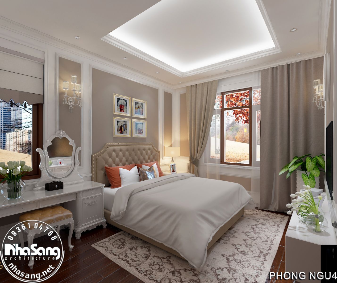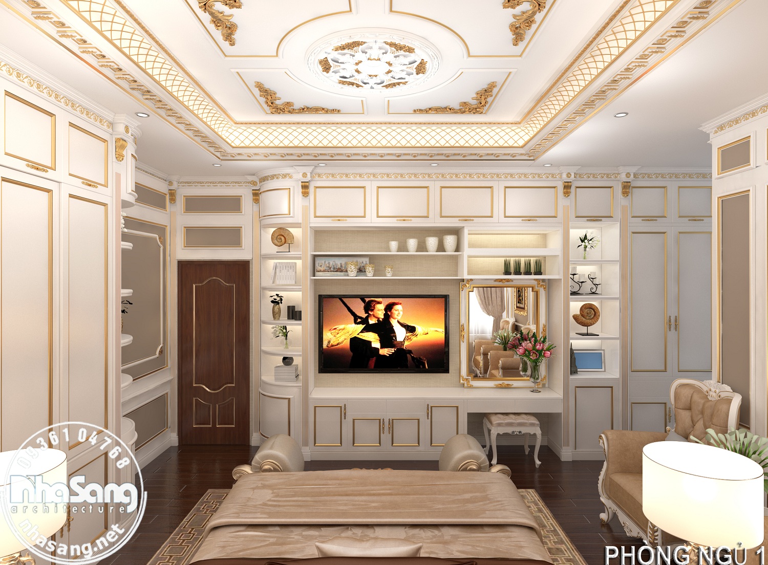 Nội thất phòng ngủ Master: Phòng ngủ master có diện tích 29m2, kích thước 6m x 5m; khu phụ gồm phòng thay đồ 8m2 và vệ sinh 9m2. Đối với một phòng ngủ sang trọng như này, thì bất cứ một vật dụng nội thất nào dù nhỏ nhất cũng phải sang trọng xứng tầm. Mẫu bàn phấn thiết kế kiểu tân cổ điển, làm từ gỗ gõ đỏ cao cấp, hoa văn đục tay tinh xảo. Điểm nhấn dát vàng tạo nên sự đắt giá của đồ nội thất. Chân bàn, chân ghế, và khung gương được thiết kế đục tay rất cầu kỳ, đường nét mềm mại quyến rũ. Mặt bàn đá marble sang trọng sạch sẽ. Mặt ghế bọc đệm mouse và nhung mềm mại nâng niu người sử dụng. Gương tráng bạc đắt giá nên hình ảnh phản chiếu rất chân thực tươi sáng giúp nạp thêm năng lượng tươi mới mỗi ngày cho chủ nhân.