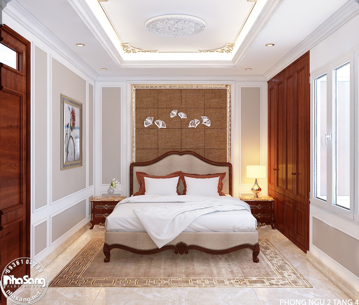 Biệt thự tân cổ điển mái thái xây dựng tại Hải Dương cho gia đình anh Việt gồm 2 tầng có 5 phòng ngủ. Trên đây là giường ngủ của phòng ngủ 3 có diện tích 24m2. Giường ngủ thiết kế theo phong cách tân cổ điển và được sản xuất tại Việt Nam. Quý khách hàng có nhu cầu có thể liên hệ trực tiếp với Nhà Sang để được tư vấn đo đạc, đặt đóng theo đúng ý thích.