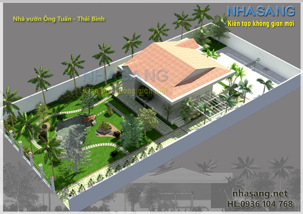 Chủ đầu tư: Ông Tuấn - Tiền Hải - Thái Bình Thiết kế sân vườn cho Nhà ở truyền thống Bắc Bộ Diện tích quy hoạch: 14m x 28m Năm xây dựng : 2012 Nhà ở với Kiến trúc truyền thống cách tân kết cấu bê tông gạch đá kết hợp với gỗ. Sân vườn gồm các không gian: Đường ô tô bằng gạch lát xen cỏ, Giàn hoa trang trí và là chỗ đậu xe, Sân câu lông sau nhà, không gian uống trà ngoài trời. Đặc biệt với hồ cá koi được thiết kế giữa vườn vừa làm tươi mới không gian ở và thư giãn tuyệt vời...