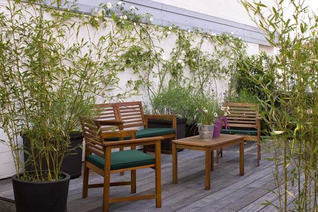 Các mảng tường được phủ xanh bởi cây leo và những chậu cây hoa. Nền sàn được đóng khung và lát ván gỗ deck (một loại gỗ nhựa chuyên sử dụng cho việc trang trí sàn ngoài trời). Các chậu trúc chỉ vàng được đặt để che chắn các tầm nhìn tạo thành một không gian kín và rất riêng tư.
