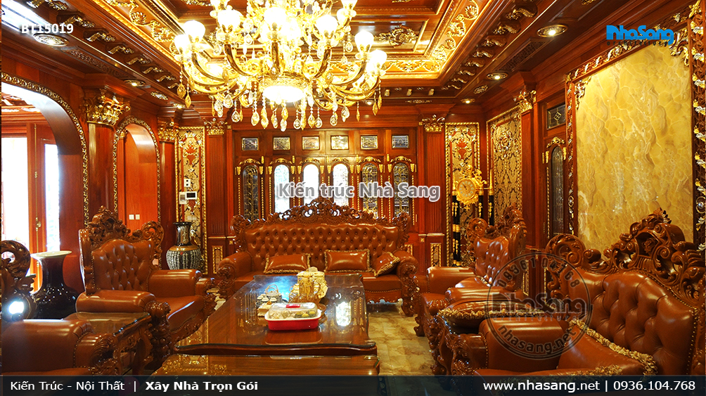 Nhà Sang đã thi công hoàn thiện dinh thự hoành tráng với từng đường nét chi tiết hoa văn phào chỉ được trau truốt không góc chết; nội thất với đội thợ chuyên nghiệp, tiết kiệm tối đa gỗ đục đẽo cho gia chủ.